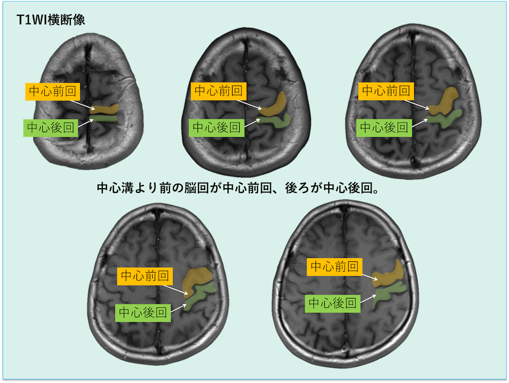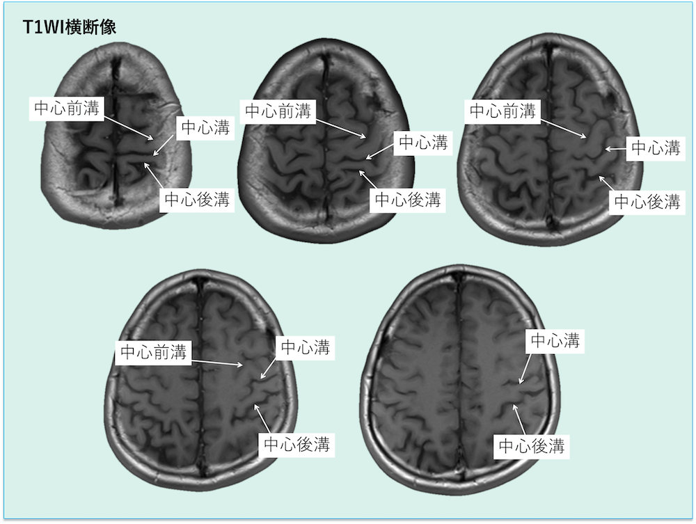 頭部CT、MRIにおける中心溝、中心前溝、中心後溝、中心前回、中心後回の解剖