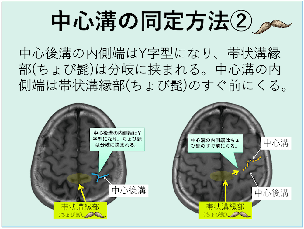 - 中心後溝の内側端はY字型になり、帯状溝縁部(ちょび髭)は分岐に挟まれる。中心溝の内側端は帯状溝縁部(ちょび髭)のすぐ前にくる。