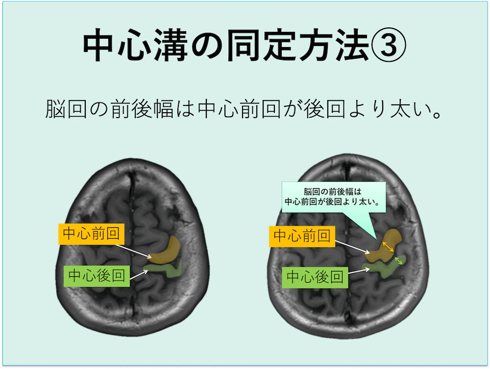 脳回の前後幅は中心前回が後回より太いという原則があります。