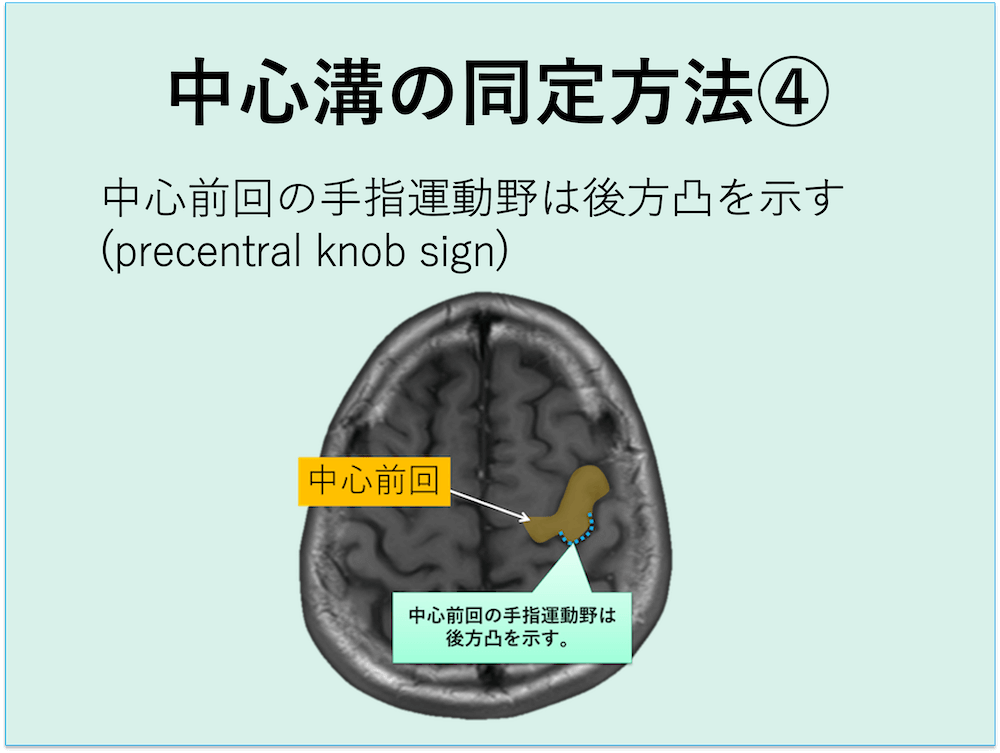 中心前回の手指運動野は後方凸を示し、precentralknob sign(中心前回ノブサイン)と呼ばれます。