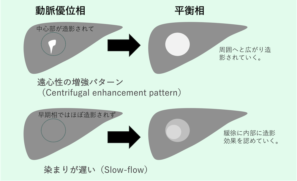 - 典型的には。ダイナミックCTやMRIにおいて、早期相で点状の強い増強(globular enhancement)が見られ、辺縁から造影され、造影効果は徐々に中心部に広がっていき(progressive centripetal fill-in)、平衡相から遅延相でも遷延する造影効果(prolonged enhancement)を認める。