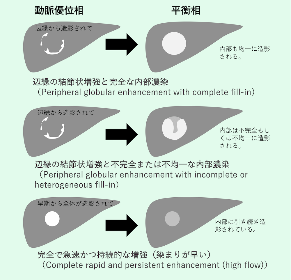 - 辺縁の結節状増強と完全な内部濃染(Peripheral globular enhancement with complete fill-in)