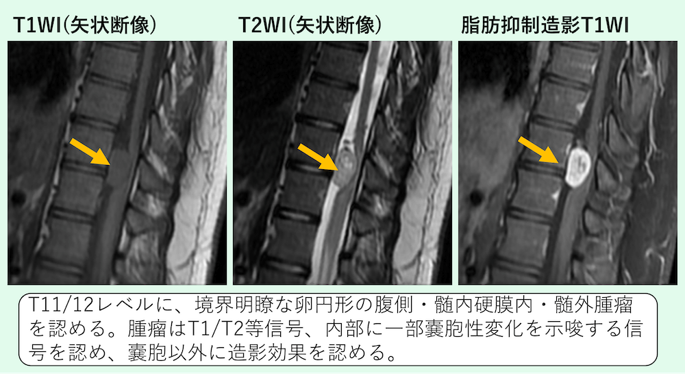 T11/12レベルに、境界明瞭な卵円形の腹側・髄内硬膜内・髄外腫瘤を認めています。