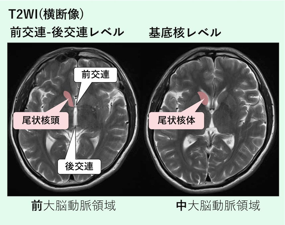 - 前交連、後交連が見えているスライスでは尾状核頭部→前大脳動脈領域