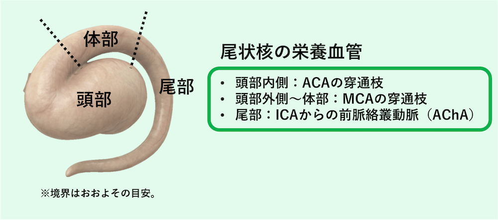 - 尾状核尾部は、側脳室下角の天井として側頭葉内側へ回り込む細長い部分であり、血管支配は前脈絡叢動脈(AChA)が主体である。