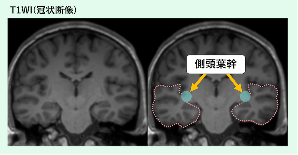 側頭葉の根や茎のように見える白質部分が側頭葉幹です。