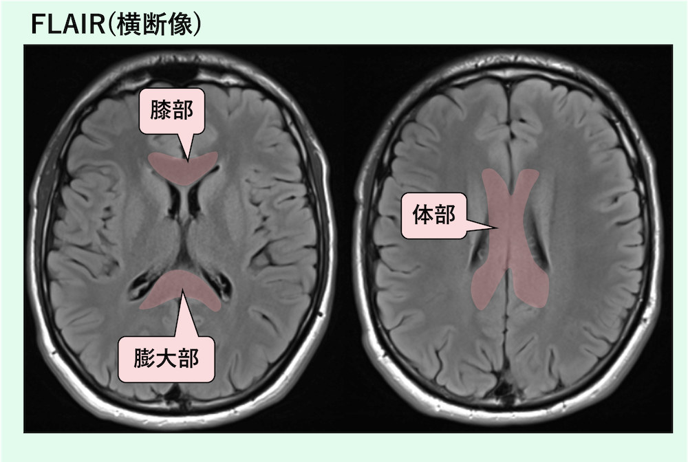 • 膨大部(splenium):後方で厚みが増すため、横断像でも比較的認識しやすい。側脳室三角部〜後角付近の上方で、正中をまたぐ厚めの白質として同定する。
