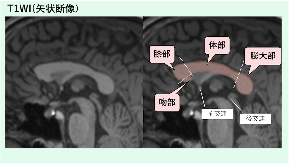 矢状断像での脳梁(corpus callosum)の解剖