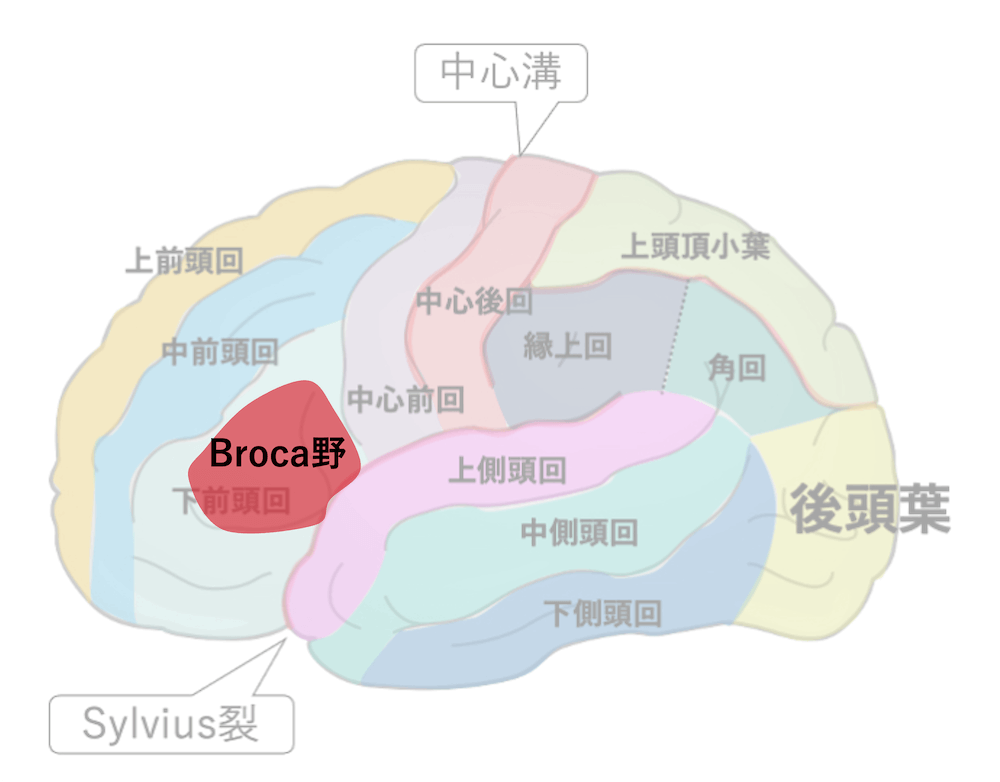 - Broca野は、一般に前頭葉の左下前頭回(IFG:Inferior Frontal Gyrus)の後部に位置する。