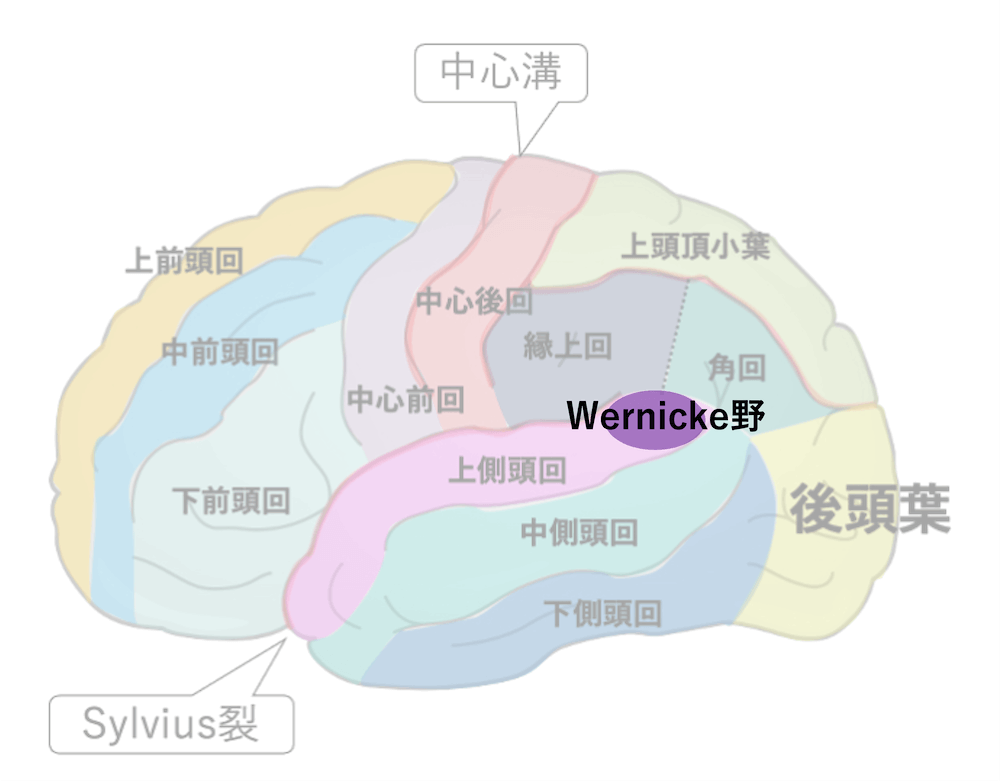 - Wernicke野の定義はBroca野よりも議論が分かれることが多いが、解剖学的には左上側頭回(STG:Superior Temporal Gyrus)の後部、ブロードマンの22野を指すのが一般的である。