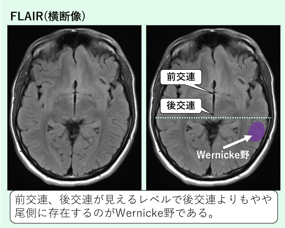 横断像では目安として前交連、後交連が見えるレベルで後交連よりもやや尾側に存在するのがWernicke野である。