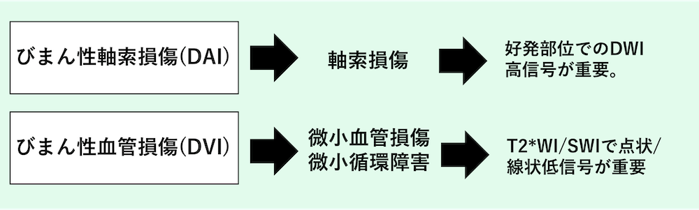 • びまん性軸索損傷(diffuse axonal injury:DAI)と並行して語られることが多いが、TMBは「血管損傷の可視化」であり、軸索損傷そのものと同一ではない。