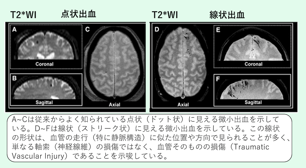A~Cは従来からよく知られている点状(ドット状)に見える微小出血を示している。D~Fは線状(ストリーク状)に見える微小出血を示している。この線状の形状は、血管の走行(特に静脈構造)に似た位置や方向で見られることが多く、単なる軸索(神経線維)の損傷ではなく、血管そのものの損傷(Traumatic Vascular Injury)であることを示唆している。