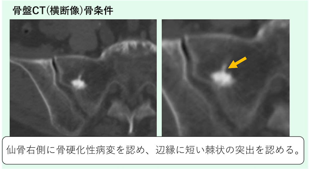 仙骨右側に骨硬化性病変を認め、辺縁に短い棘状の突出を認めています。
