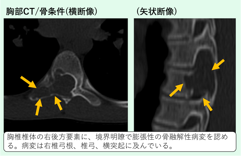 胸椎椎体の右後方要素に、境界明瞭で膨張性の骨融解性病変を認めており、病変は右椎弓根、椎弓、横突起に及んでいます。