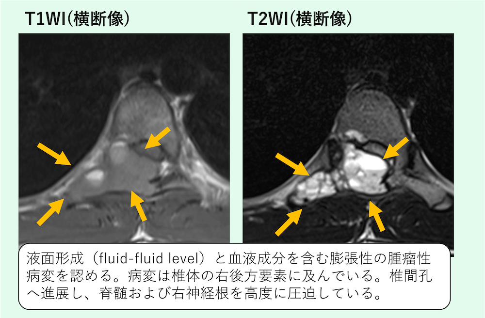 MRIにおいて液面形成(fluid-fluid level)と血液成分(T1WIで高信号)を含む膨張性の腫瘤性病変を認めています。