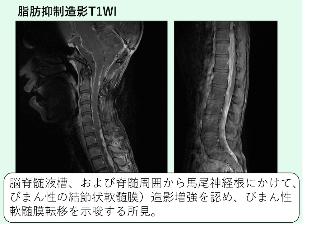 脳脊髄液槽、および脊髄周囲から馬尾神経根にかけて、びまん性の結節状軟髄膜)造影増強を認め、びまん性軟髄膜転移(髄腔内播種性転移)を示唆する所見です。