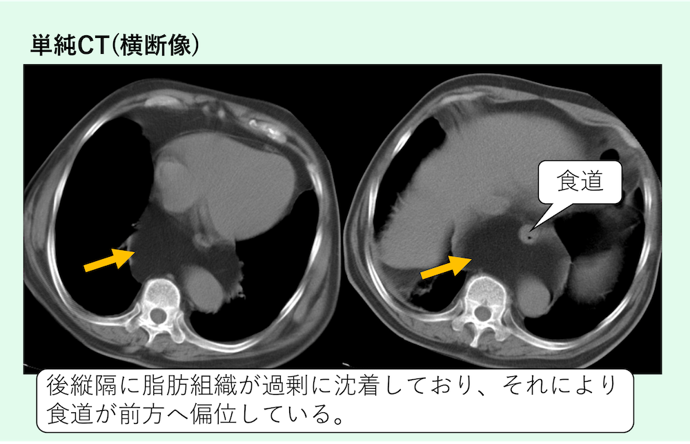 後縦隔に脂肪組織が過剰に沈着しており、それにより食道が前方へ偏位しています。