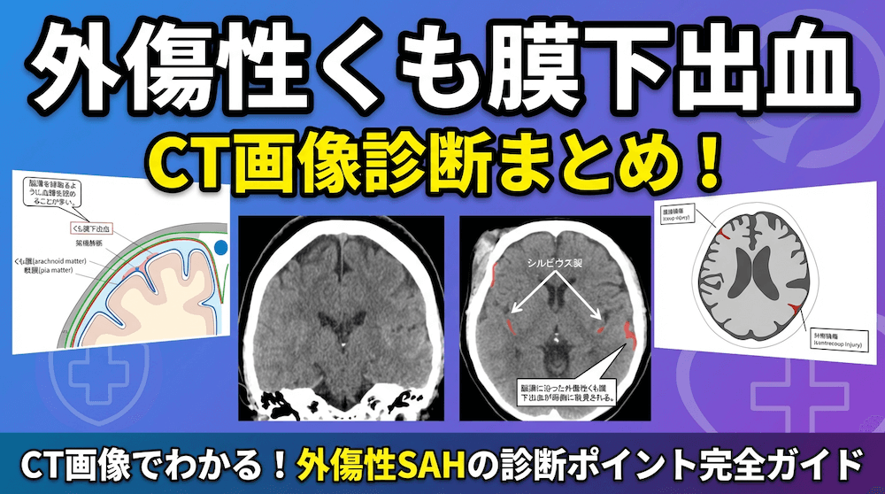 外傷性くも膜下出血の症状、CT画像診断まとめ! 更新日:2026年1月14日 公開日:2016年9月17日 救急頭部 一般によく耳にするくも膜下出血は、脳動脈瘤が原因で起こることが多いものですが、外傷が原因で起こるくも膜下出血もあり、それを外傷性くも膜下出血(Traumatic subarachnoid hemorrhage)と言います […] 続きを読む