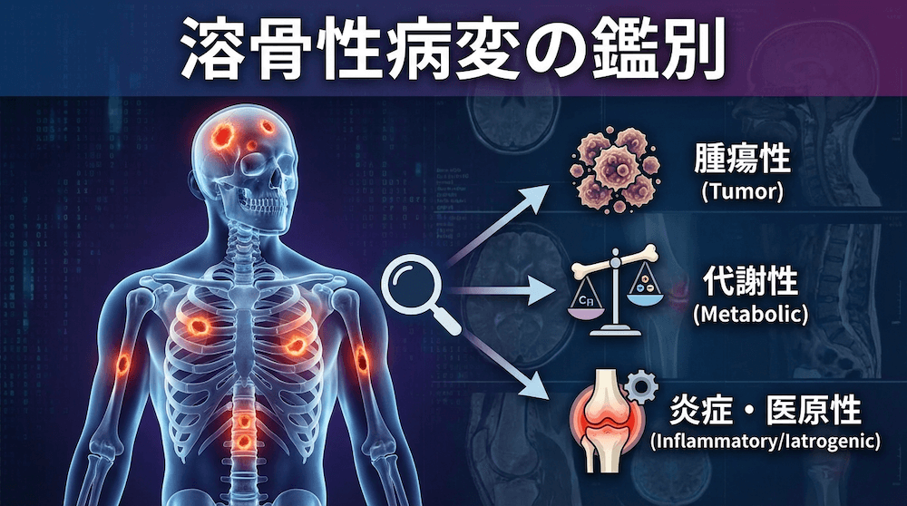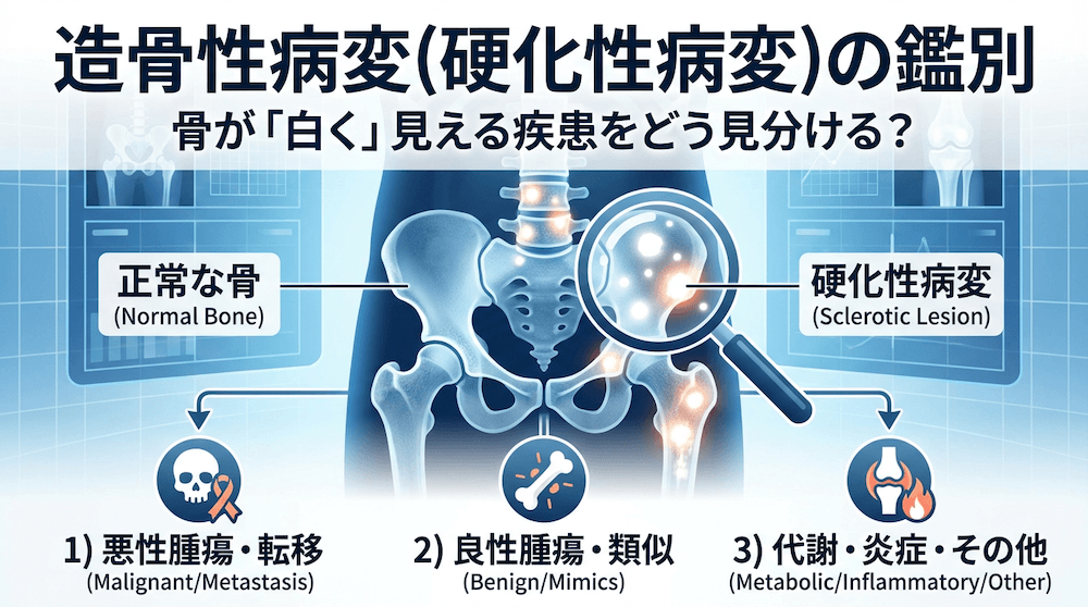 造骨性病変(硬化性病変)を来す疾患の鑑別疾患 更新日:2025年12月7日 公開日:2025年12月6日 CT検査MRI検査整形外科 造骨性(硬化性)骨病変の鑑別 CTやX線で骨が「白く」見える所見(硬化性骨病変)は、転移などの悪性疾患から、良性病変、代謝・炎症・治癒過程まで幅広い原因で起こる。 まずは病変の数(単発/多発/びまん性)と患者背景(年齢・ […] 続きを読む