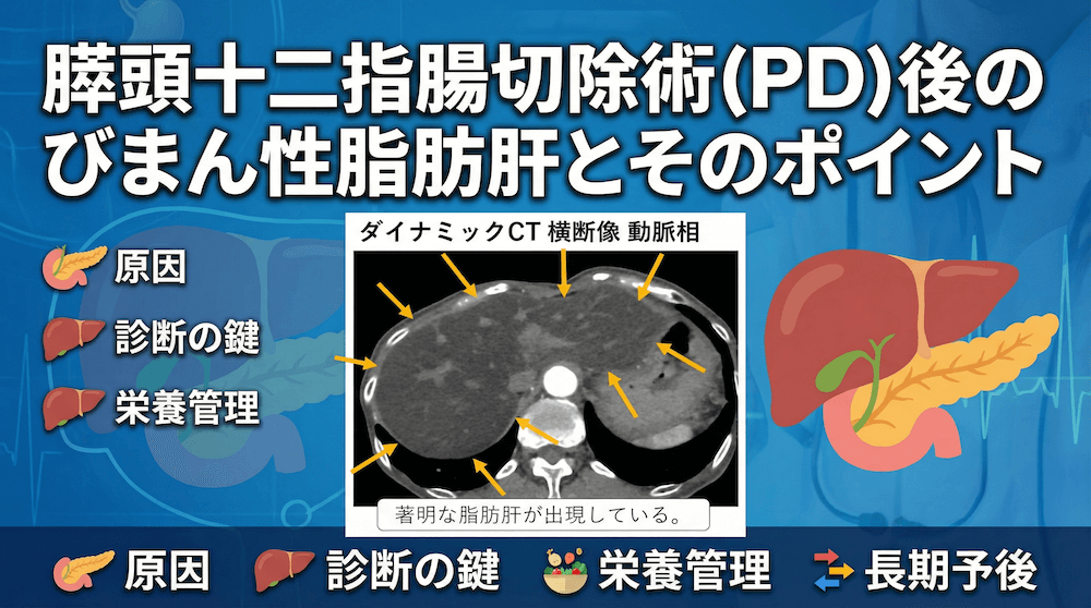 膵頭十二指腸切除術(PD)後に発症することがあるびまん性脂肪肝とそのポイント 公開日:2026年1月22日 CT検査腹部 膵頭十二指腸切除術(PD:pancreatoduodenectomy)後には、術前に脂肪肝がなくても新規(de novo)にびまん性脂肪肝が出現することがある。 典型的な「メタボ型脂肪肝」と異なり、膵外分泌不全(PEI/ […] 続きを読む