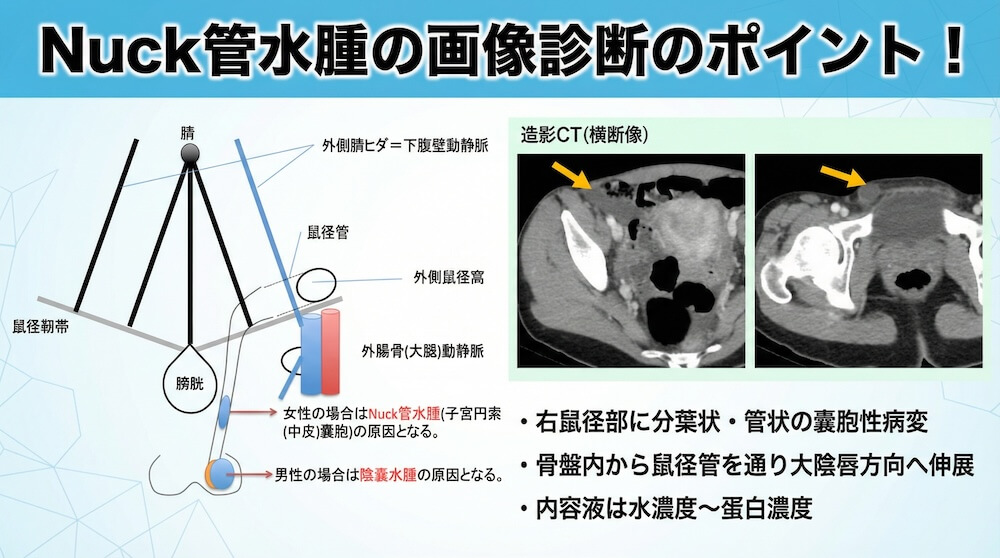 Nuck管水腫の画像診断のポイント!女性の鼠径部の嚢胞性病変として偶発的に発見されることがある 公開日:2026年2月26日 CT検査MRI検査救急泌尿器腹部 女性の鼠径部の嚢胞性病変としてのNuck管水腫 Nuck管とは、女性における腹膜の鞘状突起に相当する腹膜の憩室で、円靱帯に沿って鼠径管〜大陰唇方向へ延びうる。 通常は精度1年以内に閉鎖するが、遺残・開存すると液体貯留を来 […] 続きを読む