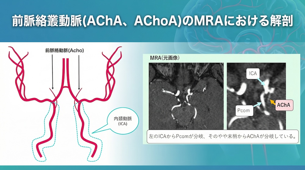 前脈絡叢動脈(AChA、AChoA)のMRAにおける解剖は? 公開日:2026年2月26日 MRI検査救急頭部 前脈絡叢動脈(anterior choroidal artery:AChA、AChoA)は細く短いが、内包後脚・視索・外側膝状体など臨床的に重要な領域へ灌流を持つ動脈である。 梗塞や、ICA終末部近傍(Pcom周囲)病変 […] 続きを読む