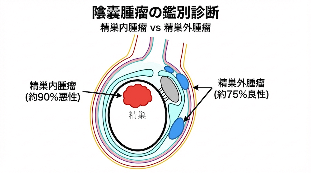 陰嚢腫瘤の鑑別診断!精巣内腫瘤か精巣外腫瘤かをまず判別! 更新日:2025年12月7日 公開日:2025年11月25日 CT検査MRI検査泌尿器 陰嚢腫瘤の鑑別 陰嚢腫瘤はまず「精巣内腫瘤(intratesticular mass)」か「精巣外腫瘤(paratesticular / extratesticular mass)」かを判定する。 精巣腫瘤の約90%は悪 […] 続きを読む