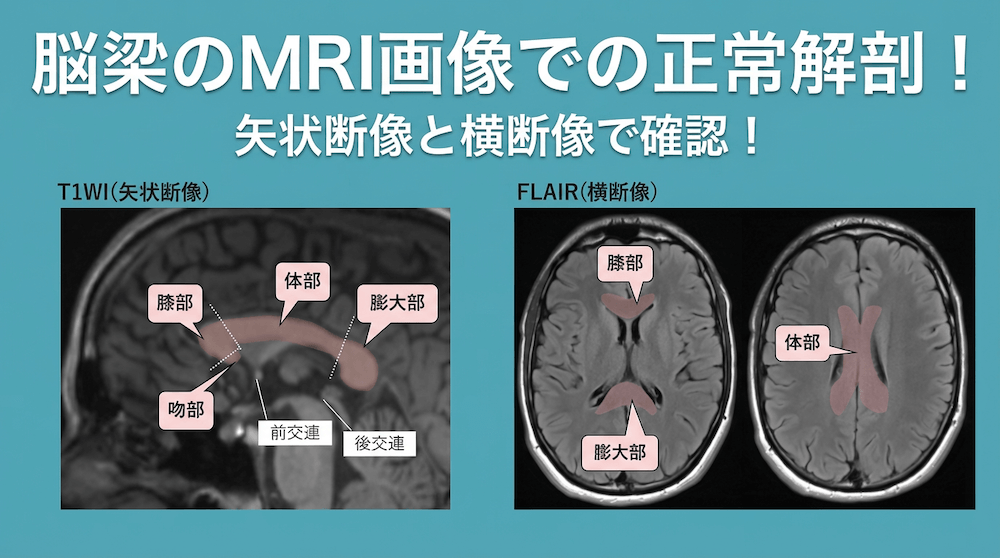 脳梁のMRI画像での正常解剖!矢状断像と横断像で確認! 公開日:2025年12月15日 CT検査MRI検査頭部 脳梁(corpus callosum)は左右大脳半球を連絡する最大の交連線維束(commissural fiber bundle)である。 矢状断像での脳梁(corpus callosum)の解剖 矢状断は脳梁の輪郭が最 […] 続きを読む