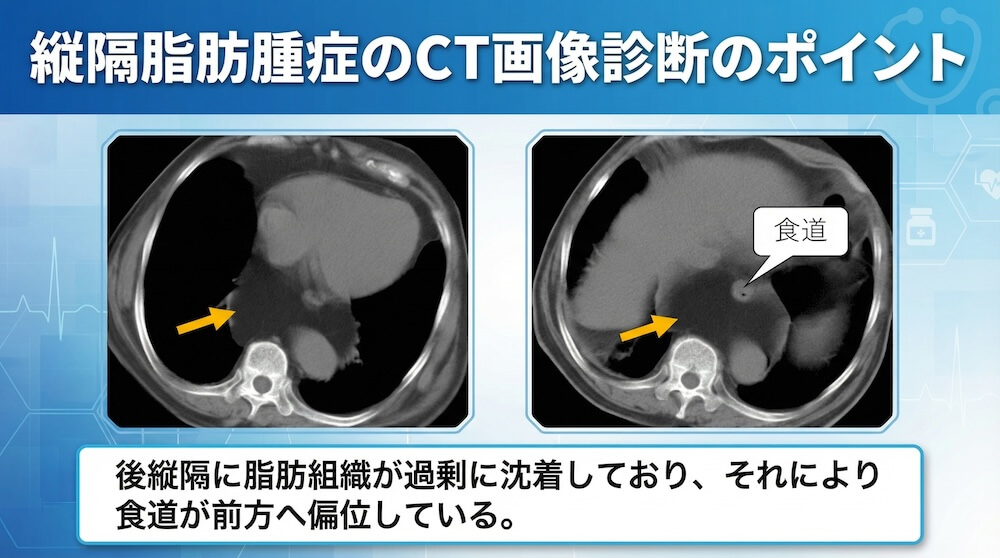 縦隔脂肪腫症のCT画像診断のポイント 公開日:2026年3月7日 CT検査MRI検査救急胸部 縦隔脂肪腫症(Mediastinal lipomatosis)とは? 縦隔内に被膜を持たない成熟脂肪組織が広範かつ対称性(あるいは非対称性)に蓄積する良性の病態である。 肥満、ステロイドの長期投与、クッシング症候群などに […] 続きを読む