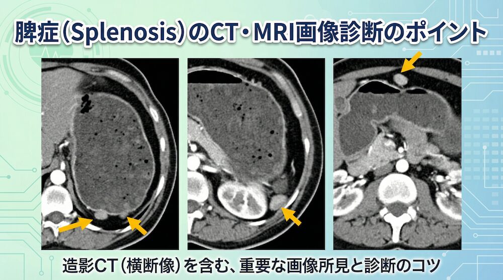 脾症(splenosis)のCT,MRI画像診断のポイント 公開日:2026年3月7日 CT検査MRI検査救急脾臓腹部 脾症(splenosis)とは? 脾症(splenosis)は、腹部外傷による脾臓破裂や脾摘出術などの際に、飛散した脾臓組織が周囲の臓器や腹膜、腸間膜などに付着し、血管新生を経て無茎性に発育した状態を指す。いわば「脾組織 […] 続きを読む