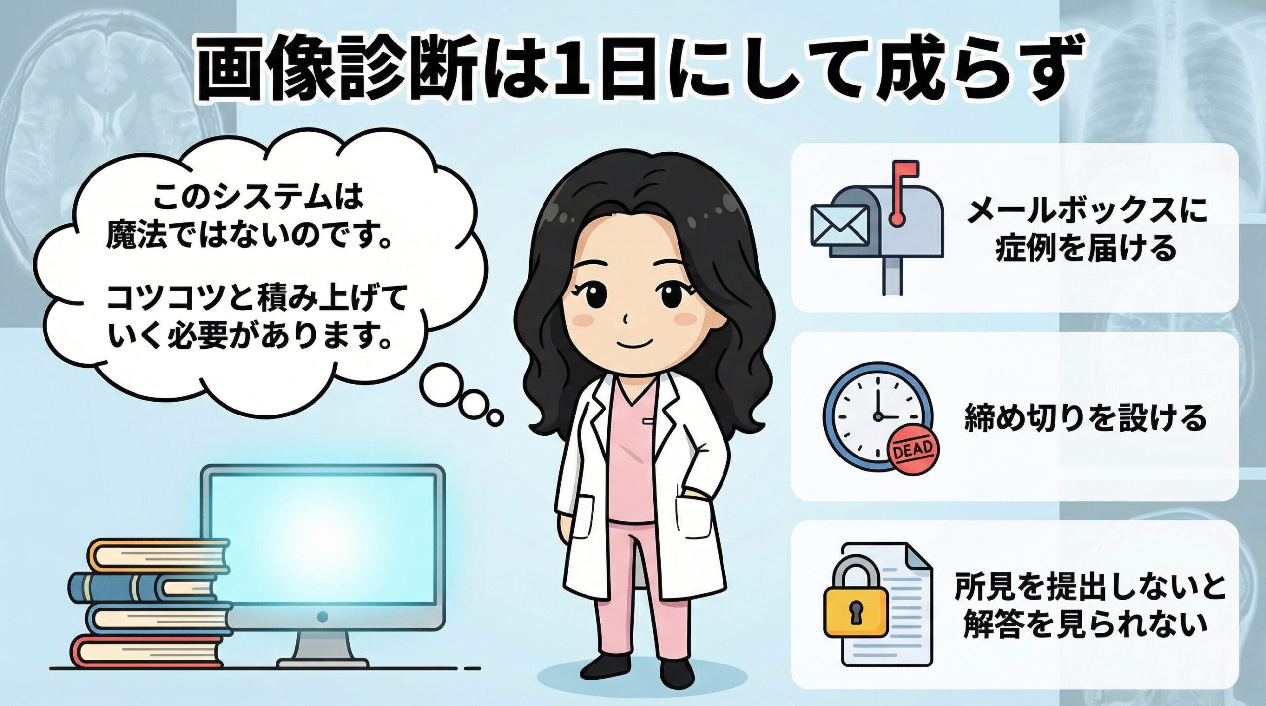 そんな可能な限り効率的にした画像診断習得システムですが、残念ながら1日や1週間などの短期詰め込みで画像診断を習得できるものではありません。